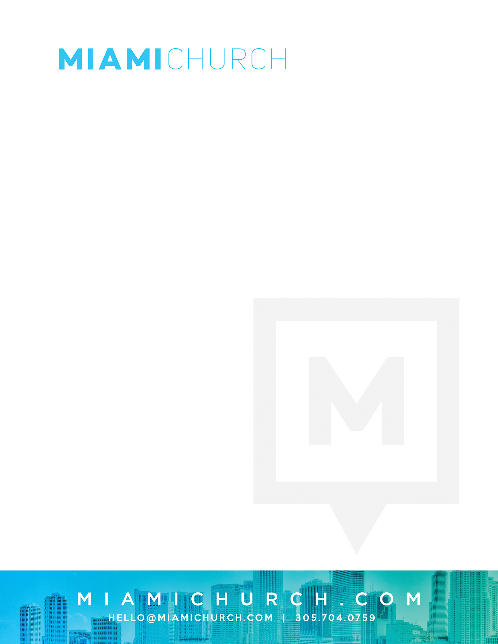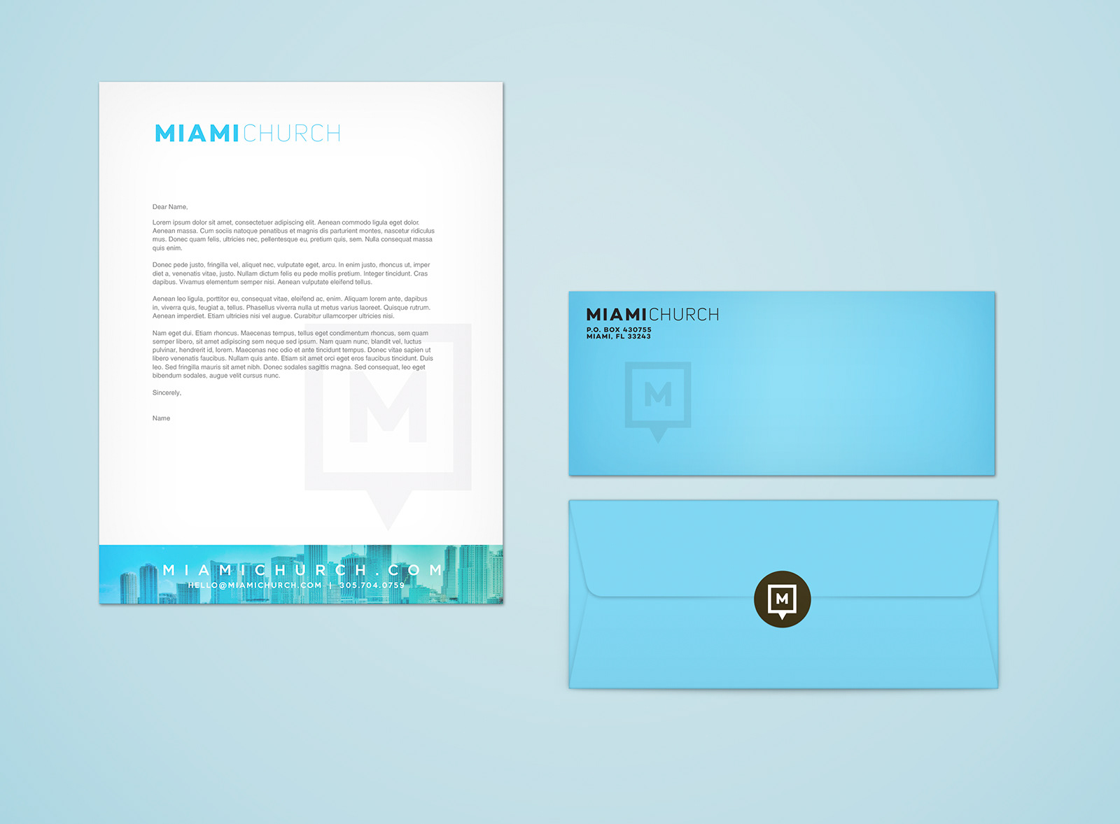 Letterhead, envelope, and sticker design for Miami Church.